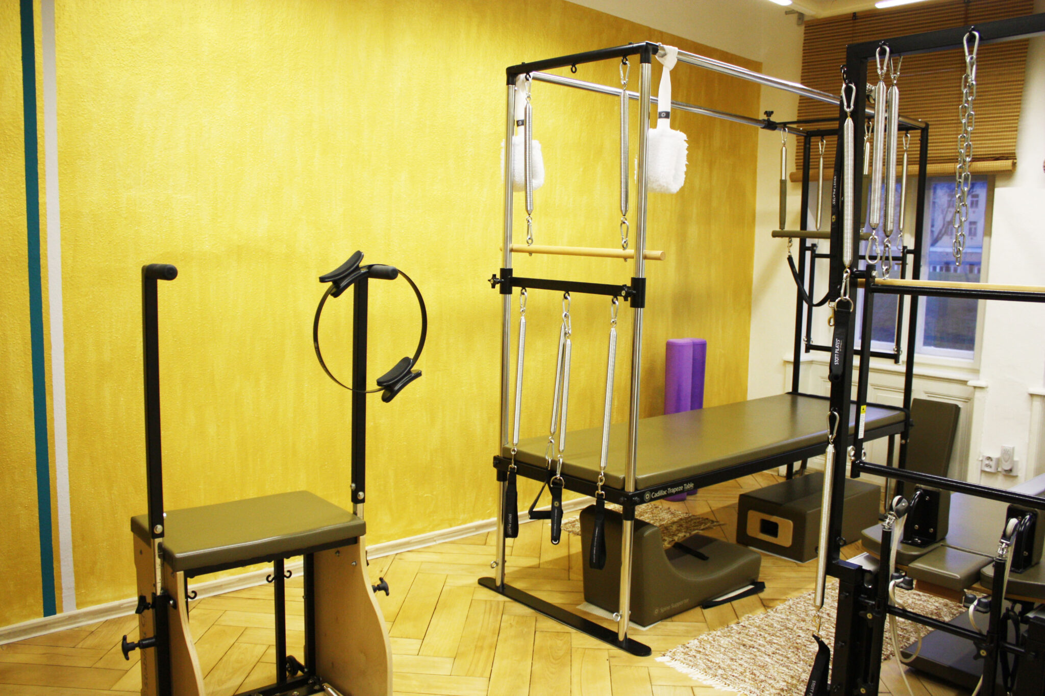 One room in the studio is fully equipped with original Canadian STOTT PILATES machines. Exercise on these machines can be in individual or group lessons(maximum 3 people).